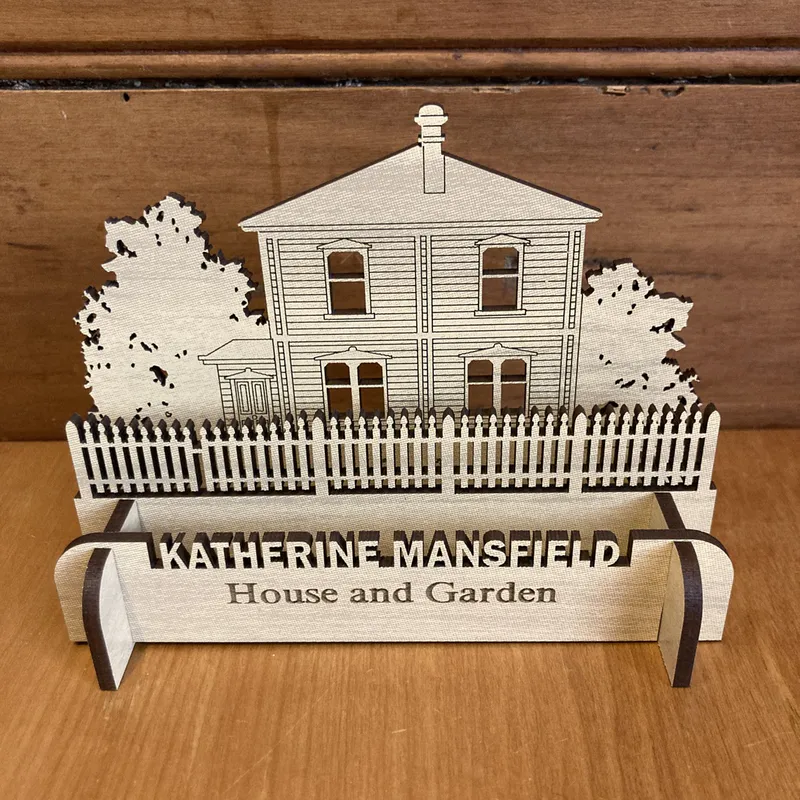 This pop-up card has three layers made from MDF that come together to make a scene. The back layer is the house Katherine Mansfield was born in, with trees on either side. The middle layer is our picket fence. The front layer has the text: 'Katherine Mansfield House & Garden'.